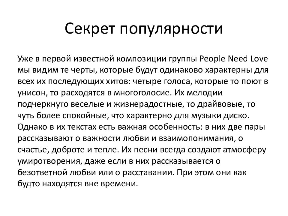 Уже в первой известной композиции группы People Need Love мы видим те черты, которые будут одинаково характерны для всех их последующих хитов: четыре голоса, которые то поют в унисон, то расходятся в многоголосие. Их мелодии подчеркнуто веселые и жизнерадостные, то драйвовые, то чуть более спокойные, что характерно для музыки диско. Однако в их текстах есть важная особенность: в них две пары рассказывают о важности любви и взаимопонимания, о счастье, доброте и тепле. Их песни всегда создают атмосферу умиротворения, даже если в них рассказывается о безответной любви или о расставании. При этом они как будто находятся вне времени.
