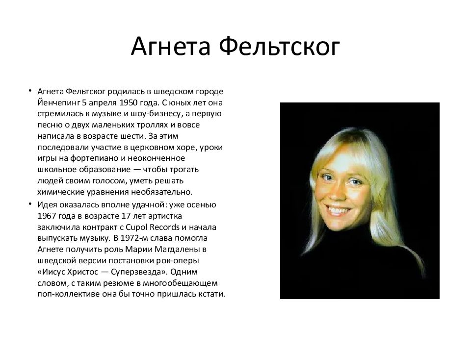 Агнета Фельтског родилась в шведском городе Йенчепинг 5 апреля 1950 года. С юных лет она стремилась к музыке и шоу-бизнесу, а первую песню о двух маленьких троллях и вовсе написала в возрасте шести. За этим последовали участие в церковном хоре, уроки игры на фортепиано и неоконченное школьное образование — чтобы трогать людей своим голосом, уметь решать химические уравнения необязательно. Идея оказалась вполне удачной: уже осенью 1967 года в возрасте 17 лет артистка заключила контракт с Cupol Records и начала выпускать музыку. В 1972-м слава помогла Агнете получить роль Марии Магдалены в шведской версии постановки рок-оперы «Иисус Христос — Суперзвезда». Одним словом, с таким резюме в многообещающем поп-коллективе она бы точно пришлась кстати.