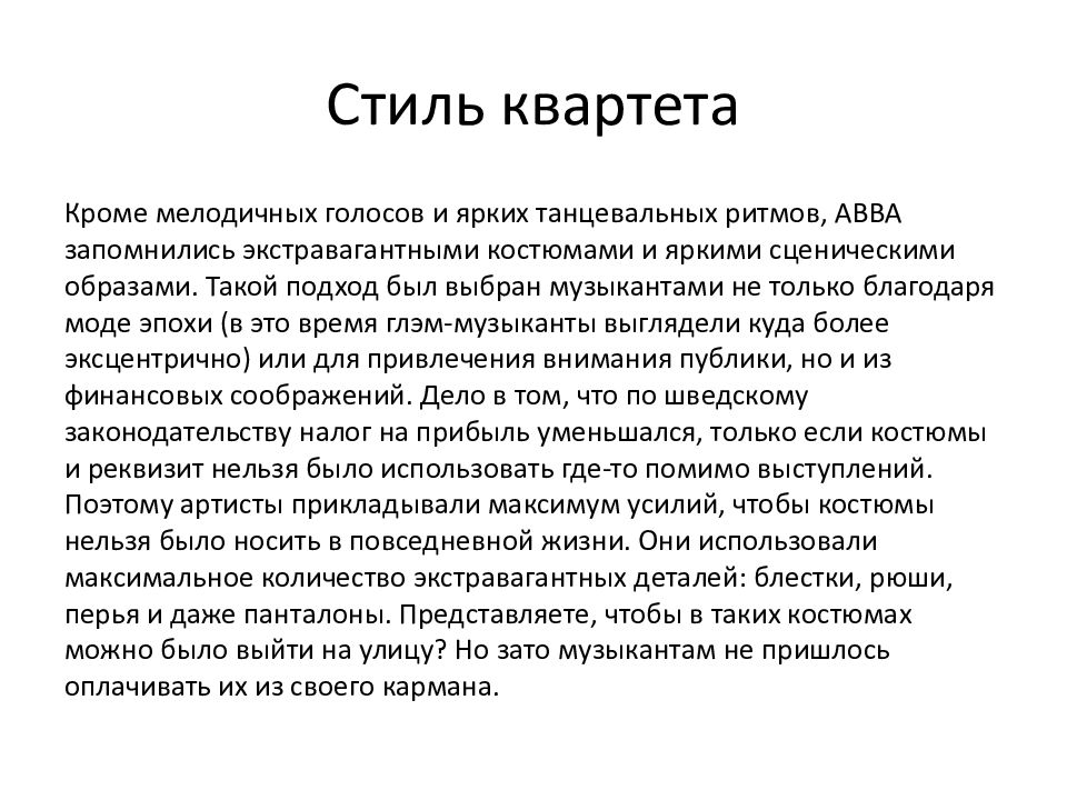 Кроме мелодичных голосов и ярких танцевальных ритмов, ABBA запомнились экстравагантными костюмами и яркими сценическими образами. Такой подход был выбран музыкантами не только благодаря моде эпохи (в это время глэм -музыканты выглядели куда более эксцентрично) или для привлечения внимания публики, но и из финансовых соображений. Дело в том, что по шведскому законодательству налог на прибыль уменьшался, только если костюмы и реквизит нельзя было использовать где-то помимо выступлений. Поэтому артисты прикладывали максимум усилий, чтобы костюмы нельзя было носить в повседневной жизни. Они использовали максимальное количество экстравагантных деталей: блестки, рюши, перья и даже панталоны. Представляете, чтобы в таких костюмах можно было выйти на улицу? Но зато музыкантам не пришлось оплачивать их из своего кармана.