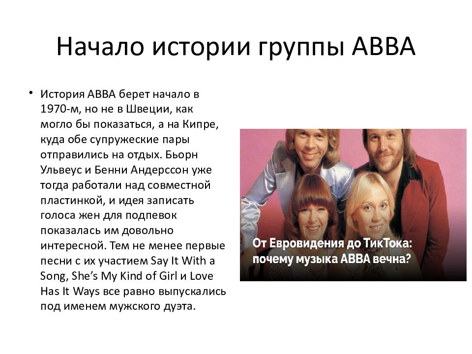 История ABBA берет начало в 1970-м, но не в Швеции, как могло бы показаться, а на Кипре, куда обе супружеские пары отправились на отдых. Бьорн Ульвеус и Бенни Андерссон уже тогда работали над совместной пластинкой, и идея записать голоса жен для подпевок показалась им довольно интересной. Тем не менее первые песни с их участием Say It With a Song, She’s My Kind of Girl и Love Has It Ways все равно выпускались под именем мужского дуэта.