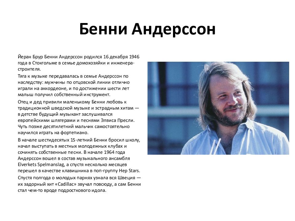 Йеран Брур Бенни Андерссон родился 16 декабря 1946 года в Стокгольме в семье домохозяйки и инженера-строителя. Тяга к музыке передавалась в семье Андерссон по наследству: мужчины по отцовской линии отлично играли на аккордеоне, и по достижении шести лет малыш получил собственный инструмент. Отец и дед привили маленькому Бенни любовь к традиционной шведской музыке и эстрадным хитам — в детстве будущий музыкант заслушивался европейскими шлягерами и песнями Элвиса Пресли. Чуть позже десятилетний мальчик самостоятельно научился играть на фортепиано. В начале шестидесятых 15-летний Бенни бросил школу, начал выступать в местных молодежных клубах и сочинять собственные песни. В начале 1964 года Андерссон вошел в состав музыкального ансамбля Elverkets Spelmanslag, а спустя несколько месяцев перешел в качестве клавишника в поп-группу Hep Stars. Спустя полгода о молодых парнях узнала вся Швеция — их задорный хит « Cadillac » звучал повсюду, а сам Бенни стал чем-то вроде подросткового идола.