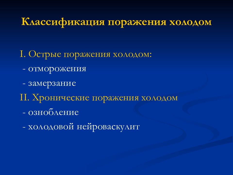 Ι. Острые поражения холодом: - отморожения - замерзание ΙΙ. Хронические поражения холодом - ознобление - холодовой нейроваскулит