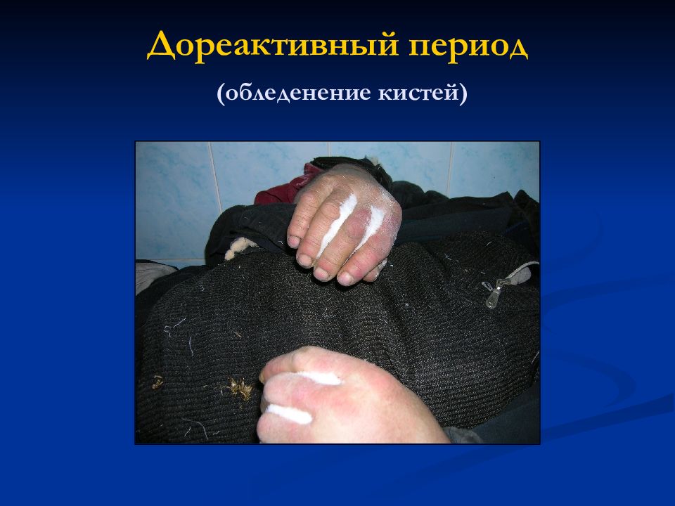 Проявления от момента отморожения до начала согревания и восстановления кровообращения. Жалобы на болезненные ощушения, покраснение, бледность кожного покрова в зоне поражения. Утрата или снижение чувствительности, обледенение.