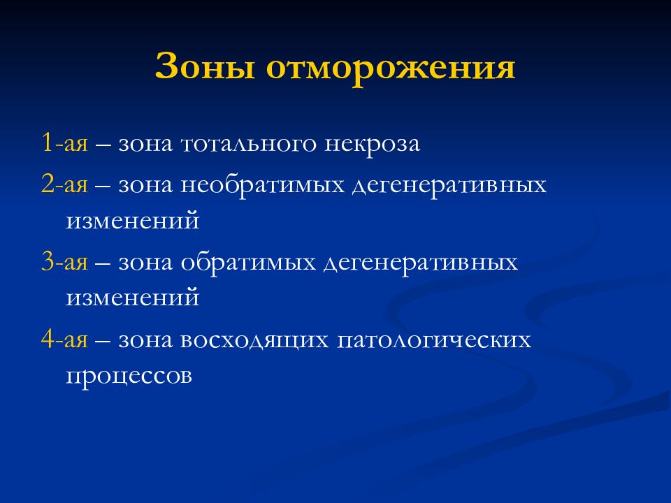 1-ая – зона тотального некроза 2-ая – зона необратимых дегенеративных изменений 3-ая – зона обратимых дегенеративных изменений 4-ая – зона восходящих патологических процессов