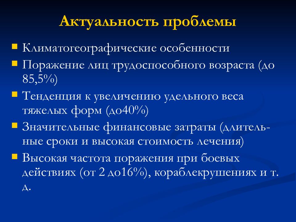 Климатогеографические особенности Поражение лиц трудоспособного возраста (до 85,5%) Тенденция к увеличению удельного веса тяжелых форм (до40%) Значительные финансовые затраты (длитель-ные сроки и высокая стоимость лечения) Высокая частота поражения при боевых действиях (от 2 до16%), кораблекрушениях и т. д.