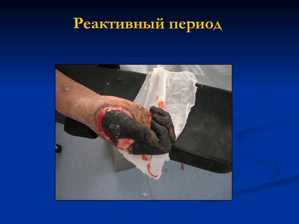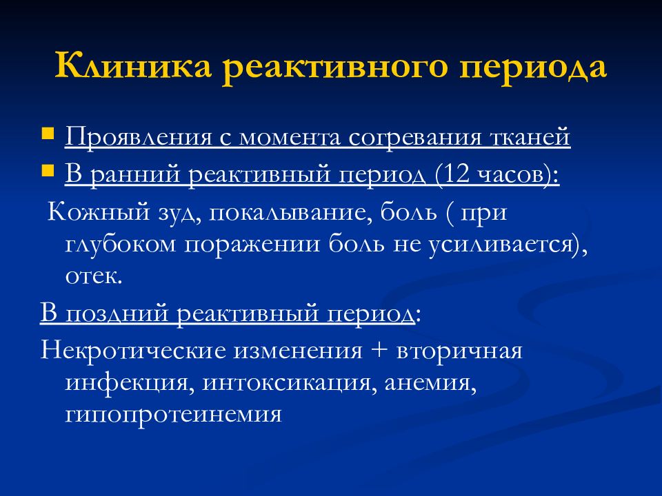 Проявления с момента согревания тканей В ранний реактивный период (12 часов): Кожный зуд, покалывание, боль ( при глубоком поражении боль не усиливается), отек. В поздний реактивный период : Некротические изменения + вторичная инфекция, интоксикация, анемия, гипопротеинемия