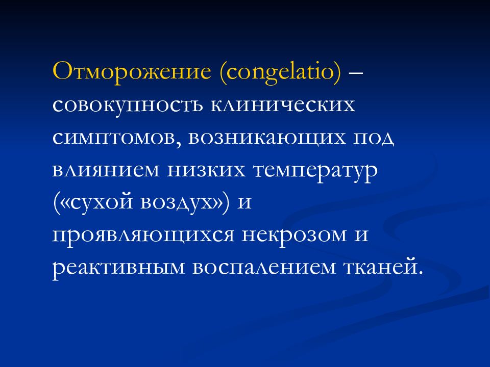 Отморожение ( congelatio) – совокупность клинических симптомов, возникающих под влиянием низких температур («сухой воздух») и проявляющихся некрозом и реактивным воспалением тканей.