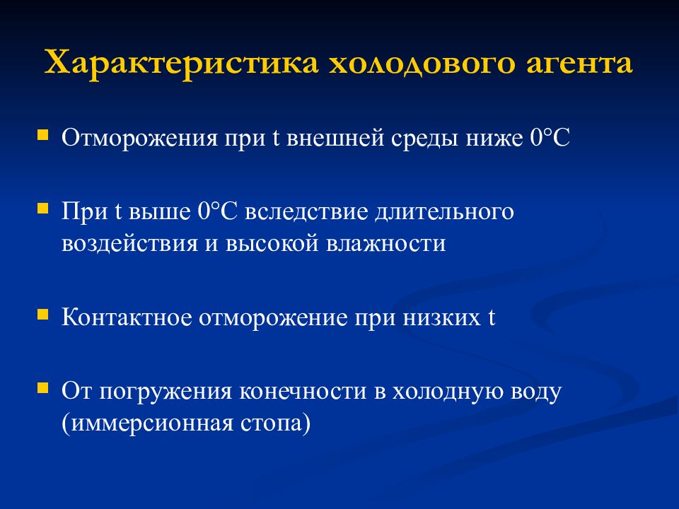 Отморожения при t внешней среды ниже 0 ° С При t выше 0 ° С вследствие длительного воздействия и высокой влажности Контактное отморожение при низких t От погружения конечности в холодную воду (иммерсионная стопа)