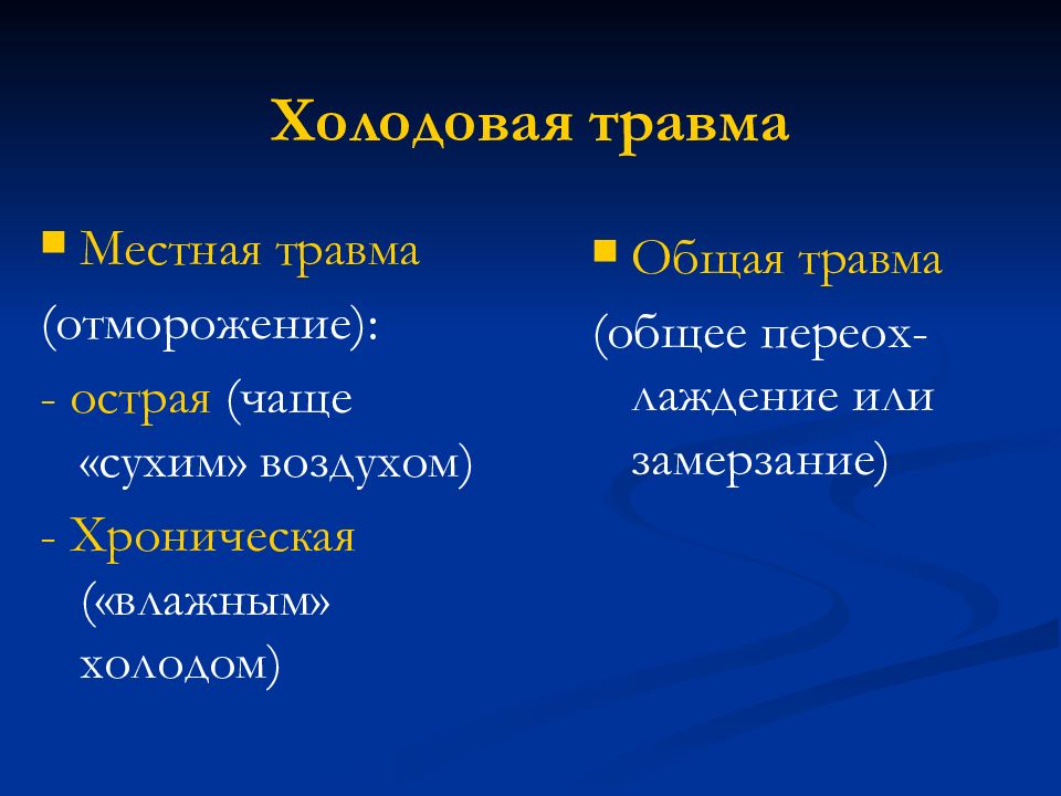 Местная травма (отморожение): - острая (чаще «сухим» воздухом) - Хроническая («влажным» холодом) Общая травма (общее переох-лаждение или замерзание)