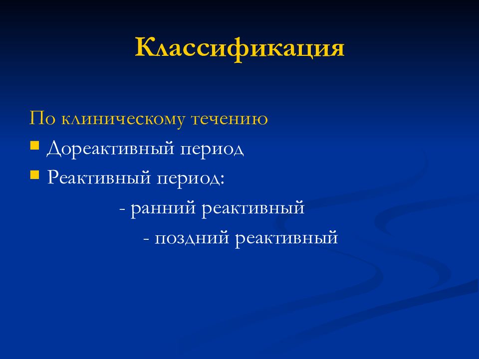 По клиническому течению Дореактивный период Реактивный период: - ранний реактивный - поздний реактивный