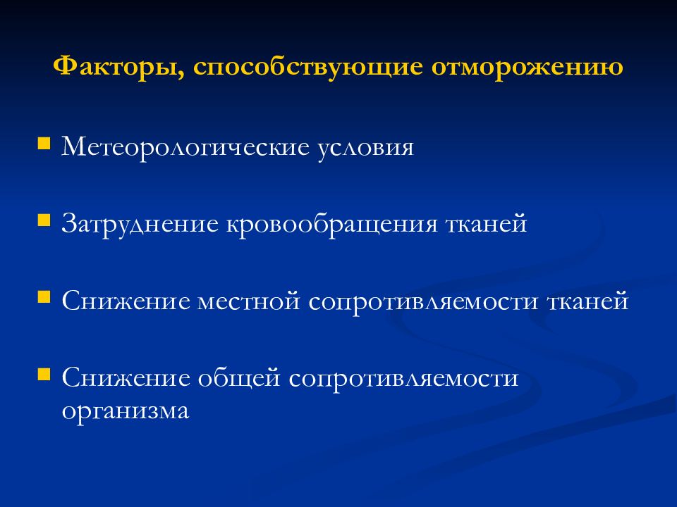 Метеорологические условия Затруднение кровообращения тканей Снижение местной сопротивляемости тканей Снижение общей сопротивляемости организма