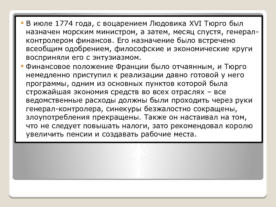 В июле 1774 года, с воцарением Людовика XVI Тюрго был назначен морским министром, а затем, месяц спустя, генерал-контролером финансов. Его назначение было встречено всеобщим одобрением, философские и экономические круги восприняли его с энтузиазмом. Финансовое положение Франции было отчаянным, и Тюрго немедленно приступил к реализации давно готовой у него программы, одним из основных пунктов которой была строжайшая экономия средств во всех отраслях – все ведомственные расходы должны были проходить через руки генерал-контролера, синекуры безжалостно сокращены, злоупотребления прекращены. Также он настаивал на том, что не следует повышать налоги, зато рекомендовал королю увеличить пенсии и создавать рабочие места.