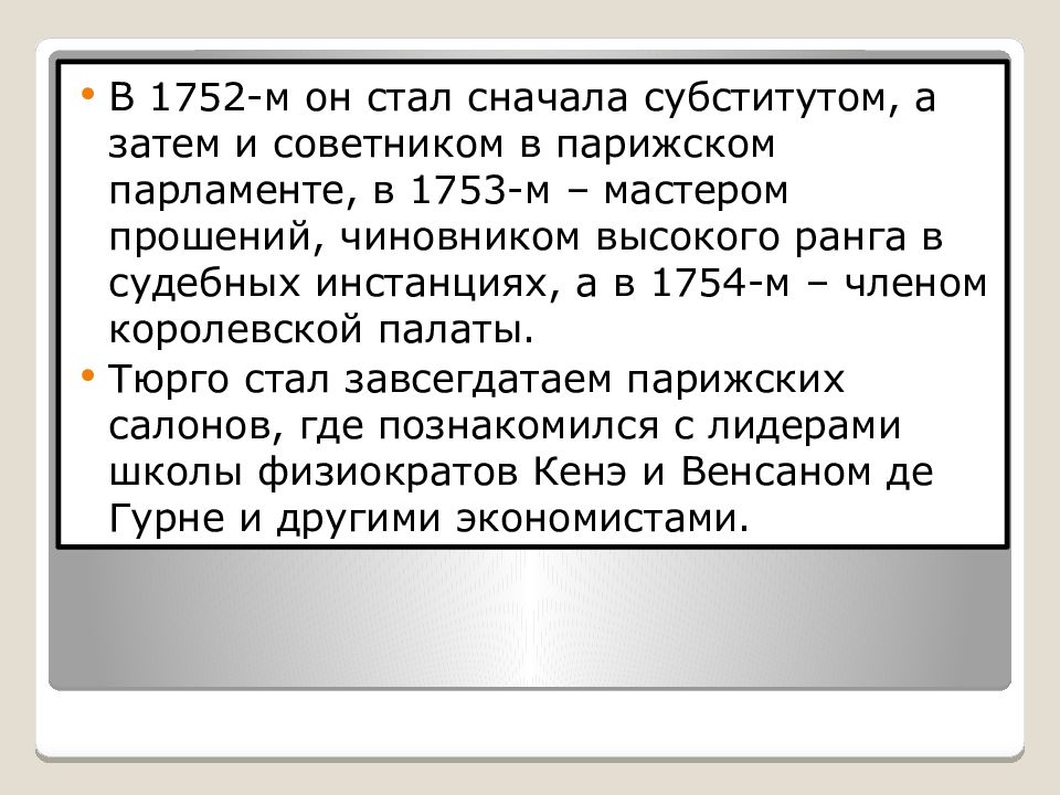 В 1752-м он стал сначала субститутом, а затем и советником в парижском парламенте, в 1753-м – мастером прошений, чиновником высокого ранга в судебных инстанциях, а в 1754-м – членом королевской палаты. Тюрго стал завсегдатаем парижских салонов, где познакомился с лидерами школы физиократов Кенэ и Венсаном де Гурне и другими экономистами.