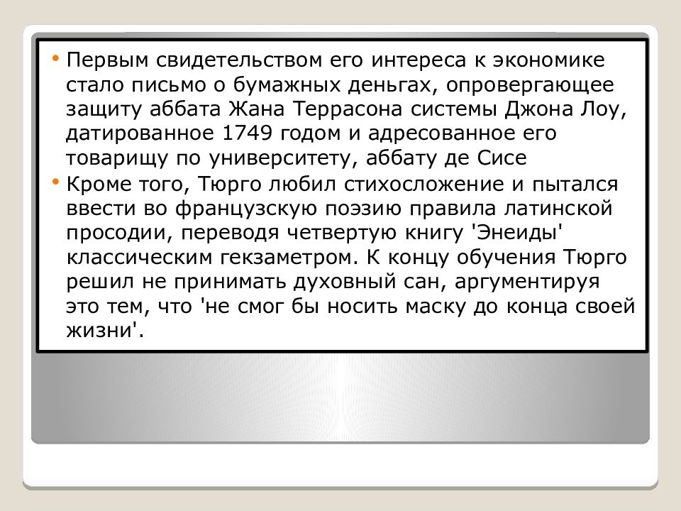 Первым свидетельством его интереса к экономике стало письмо о бумажных деньгах, опровергающее защиту аббата Жана Террасона системы Джона Лоу, датированное 1749 годом и адресованное его товарищу по университету, аббату де Сисе Кроме того, Тюрго любил стихосложение и пытался ввести во французскую поэзию правила латинской просодии, переводя четвертую книгу 'Энеиды' классическим гекзаметром. К концу обучения Тюрго решил не принимать духовный сан, аргументируя это тем, что 'не смог бы носить маску до конца своей жизни'.