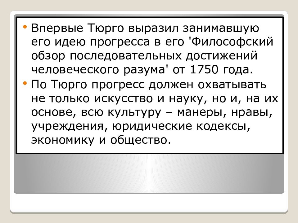 Впервые Тюрго выразил занимавшую его идею прогресса в его ' Философский обзор последовательных достижений человеческого разума ' от 1750 года. По Тюрго прогресс должен охватывать не только искусство и науку, но и, на их основе, всю культуру – манеры, нравы, учреждения, юридические кодексы, экономику и общество.