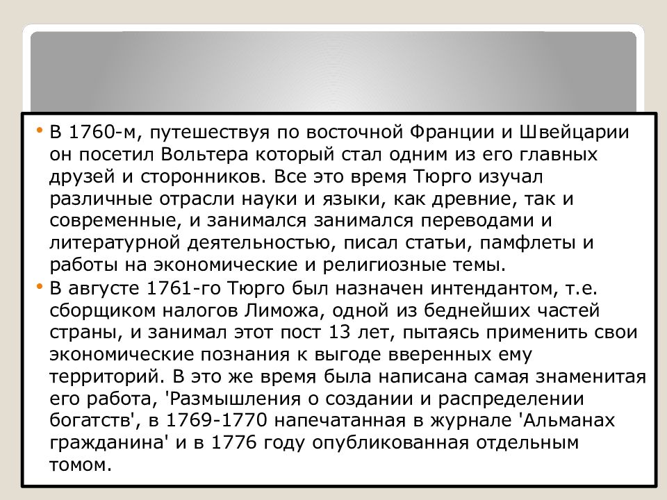В 1760-м, путешествуя по восточной Франции и Швейцарии он посетил Вольтера который стал одним из его главных друзей и сторонников. Все это время Тюрго изучал различные отрасли науки и языки, как древние, так и современные, и занимался занимался переводами и литературной деятельностью, писал статьи, памфлеты и работы на экономические и религиозные темы. В августе 1761-го Тюрго был назначен интендантом, т.е. сборщиком налогов Лиможа, одной из беднейших частей страны, и занимал этот пост 13 лет, пытаясь применить свои экономические познания к выгоде вверенных ему территорий. В это же время была написана самая знаменитая его работа, 'Размышления о создании и распределении богатств ', в 1769-1770 напечатанная в журнале 'Альманах гражданина' и в 1776 году опубликованная отдельным томом.