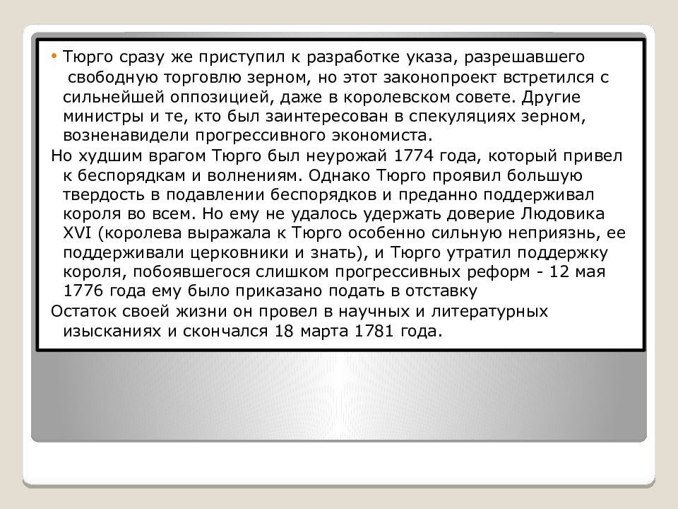 Тюрго сразу же приступил к разработке указа, разрешавшего свободную торговлю зерном, но этот законопроект встретился с сильнейшей оппозицией, даже в королевском совете. Другие министры и те, кто был заинтересован в спекуляциях зерном, возненавидели прогрессивного экономиста. Но худшим врагом Тюрго был неурожай 1774 года, который привел к беспорядкам и волнениям. Однако Тюрго проявил большую твердость в подавлении беспорядков и преданно поддерживал короля во всем. Но ему не удалось удержать доверие Людовика XVI (королева выражала к Тюрго особенно сильную неприязнь, ее поддерживали церковники и знать), и Тюрго утратил поддержку короля, побоявшегося слишком прогрессивных реформ - 12 мая 1776 года ему было приказано подать в отставку Остаток своей жизни он провел в научных и литературных изысканиях и скончался 18 марта 1781 года.