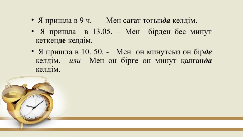 Я пришла в 9 ч. – Мен сағат тоғыз да келдім. Я пришла в 13.05. – Мен бірден бес минут кеткен де келдім. Я пришла в 10. 50. - Мен он минутсыз он бір де келдім. или Мен он бірге он минут қалған да келдім.
