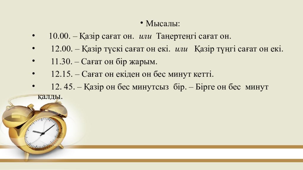 Мысалы: 10.00. – Қазір сағат он. или Таңертеңгі сағат он. 12.00. – Қазір түскі сағат он екі. или Қазір түңгі сағат он екі. 11.30. – Сағат он бір жарым. 12.15. – Сағат он екіден он бес минут кетті. 12. 45. – Қазір он бес минутсыз бір. – Бірге он бес минут қалды.