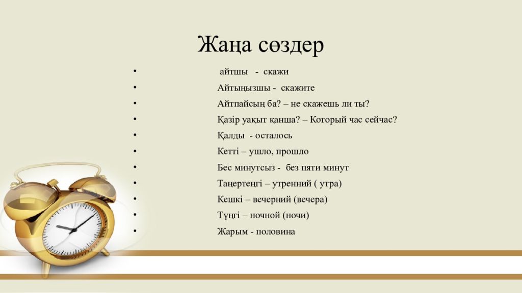айтшы - скажи Айтыңызшы - скажите Айтпайсың ба? – не скажешь ли ты? Қазір уақыт қанша? – Который час сейчас? Қалды - осталось Кетті – ушло, прошло Бес минутсыз - без пяти минут Таңертеңгі – утренний ( утра) Кешкі – вечерний (вечера) Түңгі – ночной (ночи) Жарым - половина