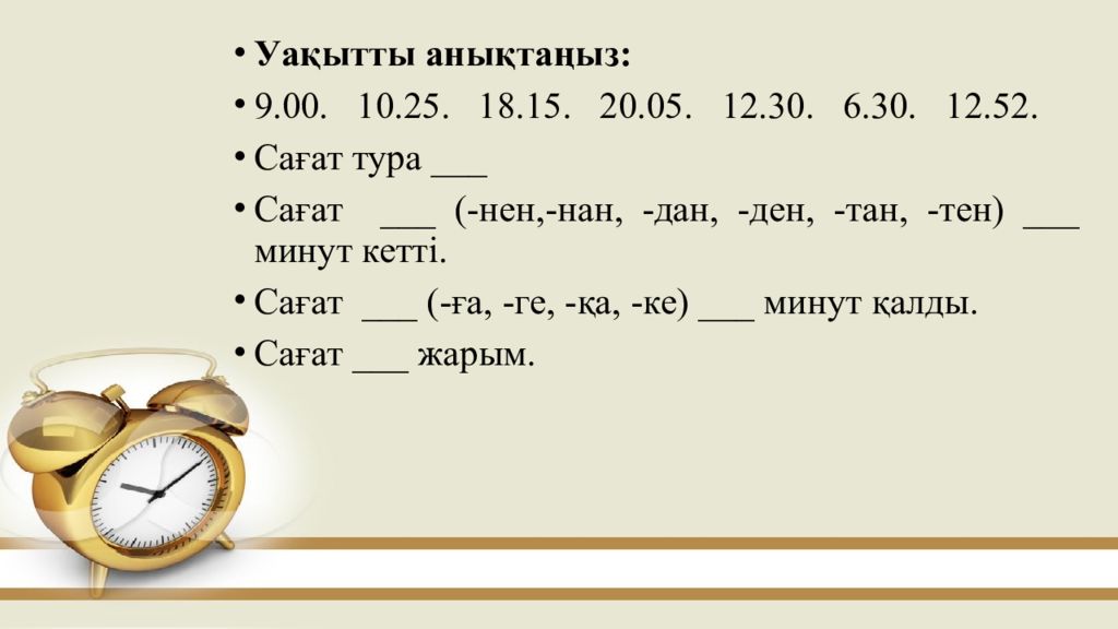 Уақытты анықтаңыз: 9.00. 10.25. 18.15. 20.05. 12.30. 6.30. 12.52. Сағат тура ___ Са ғат ___ (- нен,- нан, -дан, -ден, - тан, - тен ) ___ минут кетті. Са ғат ___ (- ға, - ге, - қа, - ке ) ___ минут қалды. Сағат ___ жарым.