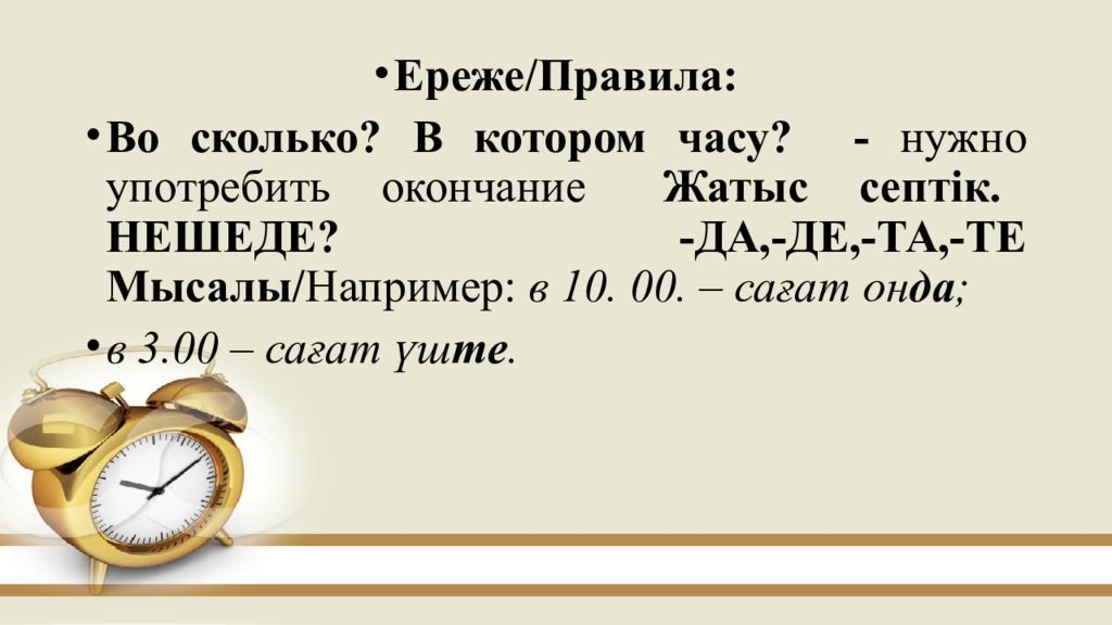 Ереже/Правила: Во сколько? В котором часу? - нужно употребить окончание Жатыс септік. НЕШЕДЕ? -ДА,-ДЕ,-ТА,-ТЕ Мысалы/ Например: в 10. 00. – сағат он да ; в 3.00 – сағат үш те.