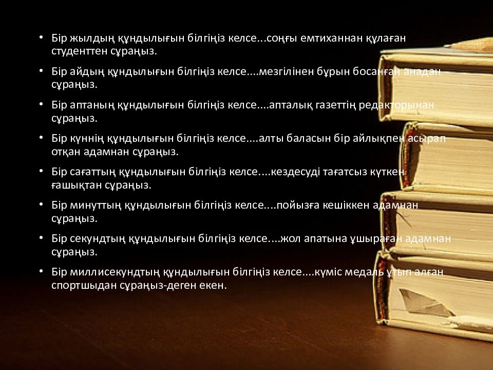 Бір жылдың құндылығын білгіңіз келсе...cоңғы емтиханнан құлаған студенттен сұраңыз. Бір айдың құндылығын білгіңіз келсе....мезгілінен бұрын босанған анадан сұраңыз. Бір аптаның құндылығын білгіңіз келсе....апталық газеттің редакторынан сұраңыз. Бір күннің құндылығын білгіңіз келсе....алты баласын бір айлықпен асырап отқан адамнан сұраңыз. Бір сағаттың құндылығын білгіңіз келсе....кездесуді тағатсыз күткен ғашықтан сұраңыз. Бір минуттың құндылығын білгіңіз келсе....пойызға кешіккен адамнан сұраңыз. Бір секундтың құндылығын білгіңіз келсе....жол апатына ұшыраған адамнан сұраңыз. Бір миллисекундтың құндылығын білгіңіз келсе....күміс медаль ұтып алған спортшыдан сұраңыз-деген екен.