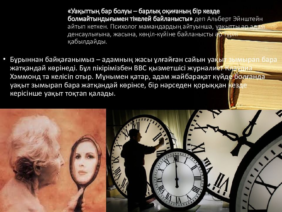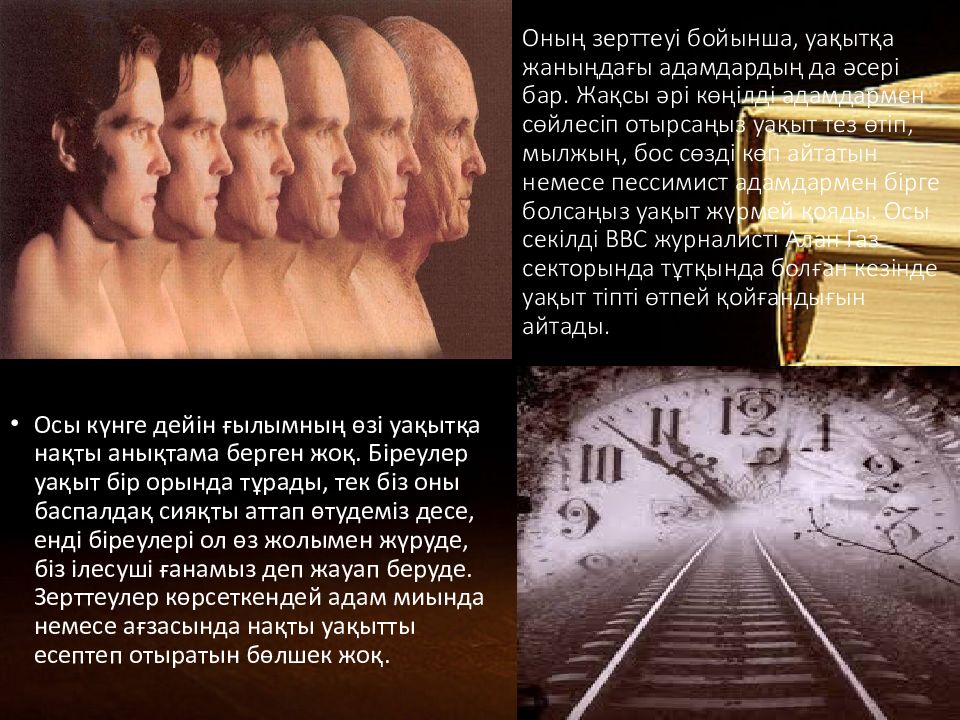 Бұрыннан байқағанымыз – адамның жасы ұлғайған сайын уақыт зымырап бара жатқандай көрінеді. Бұл пікірімізбен ВВС қызметшісі журналист Клаудиа Хэммонд та келісіп отыр. Мұнымен қатар, адам жайбарақат күйде болғанда уақыт зымырап бара жатқандай көрінсе, бір нәрседен қорыққан кезде керісінше уақыт тоқтап қалады.
