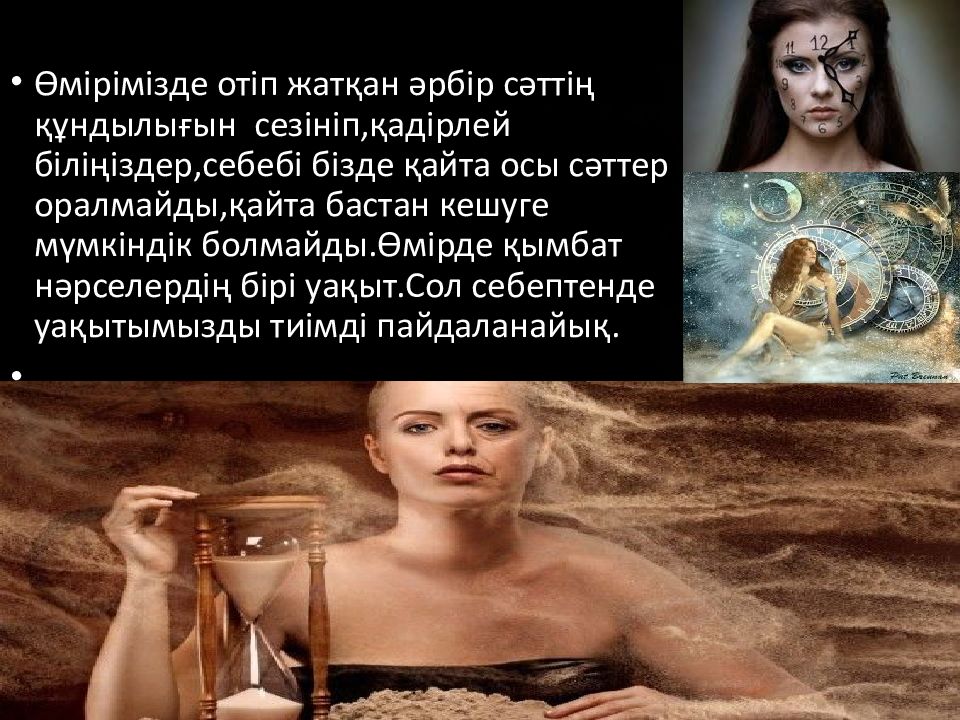 Өмірімізде отіп жатқан әрбір сәттің құндылығын сезініп,қадірлей біліңіздер,себебі бізде қайта осы сәттер оралмайды,қайта бастан кешуге мүмкіндік болмайды.Өмірде қымбат нәрселердің бірі уақыт.Сол себептенде уа қытымызды тиімді пайдаланайық.