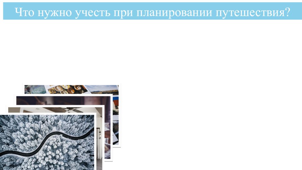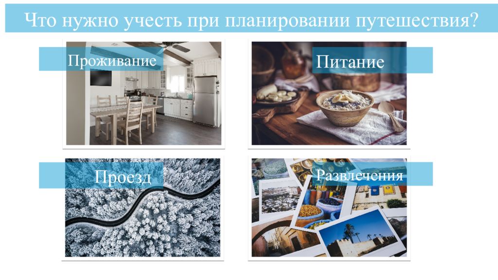 Что нужно учесть при планировании путешествия? Питание Проживание Проезд Развлечения