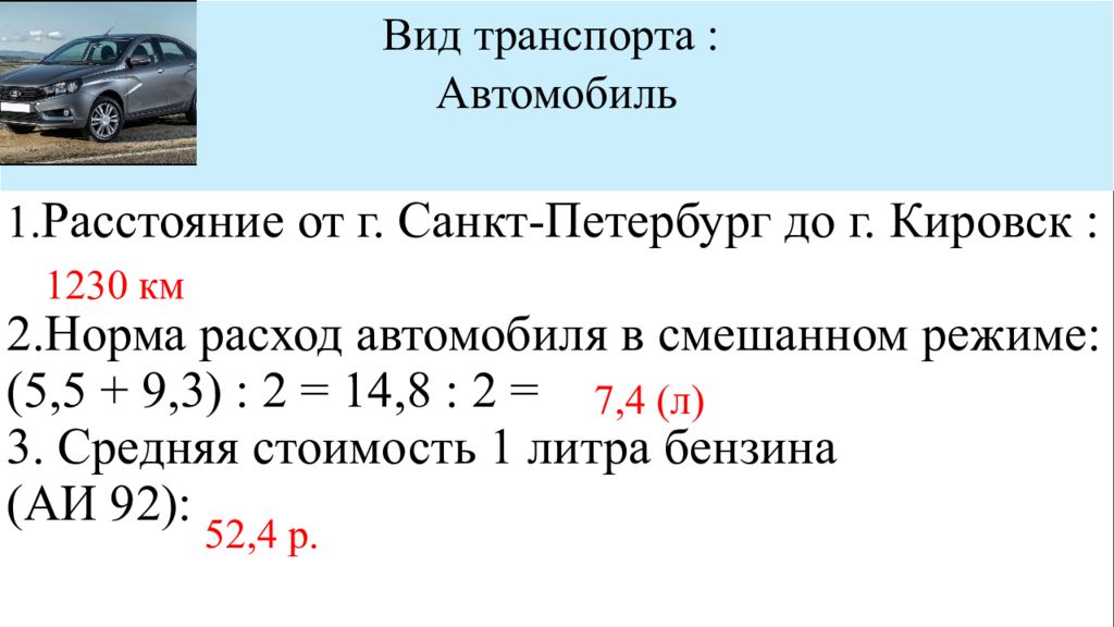 Вид транспорта : Автомобиль 1. Расстояние от г. Санкт-Петербург до г. Кировск : 2. Норма р асход автомобиля в смешанном режиме: (5,5 + 9,3) : 2 = 14,8 : 2 = 3. Средняя стоимость 1 литра бензина (АИ 92): 7,4 (л) 1230 км 52,4 р.