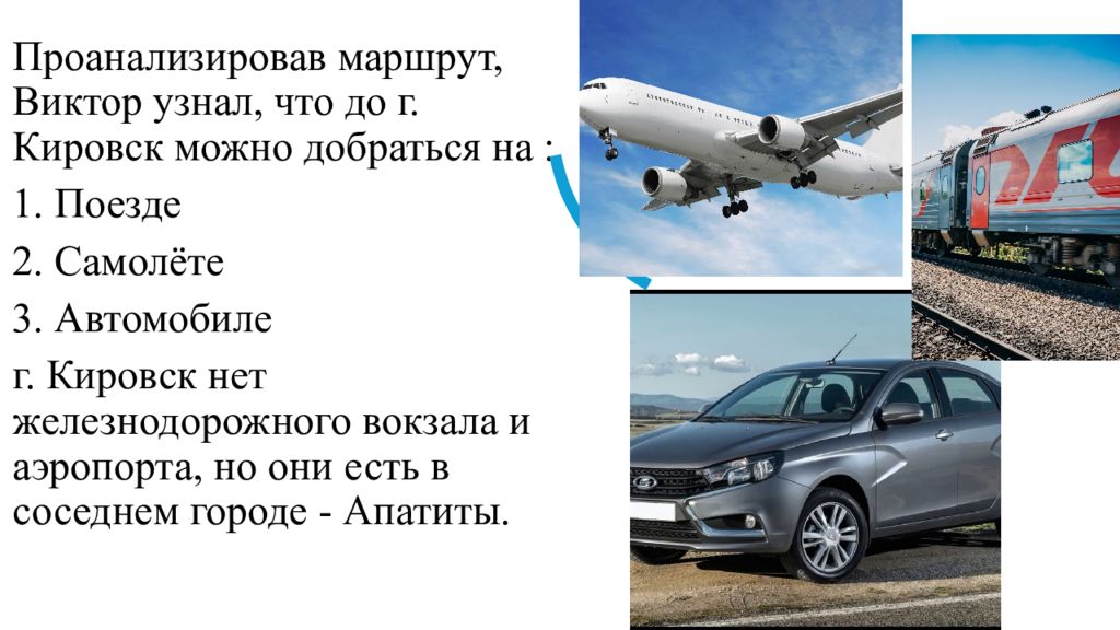 Проанализировав маршрут, Виктор узнал, что до г. Кировск можно добраться на : 1. Поезде 2. Самолёте 3. Автомобиле г. Кировск нет железнодорожного вокзала и аэропорта, но они есть в соседнем городе - Апатиты.