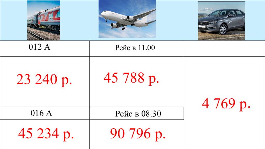 23 240 р. 45 234 р. 90 796 р. 45 788 р. 4 769 р. 016 А 012 А Рейс в 11.00 Рейс в 08.30