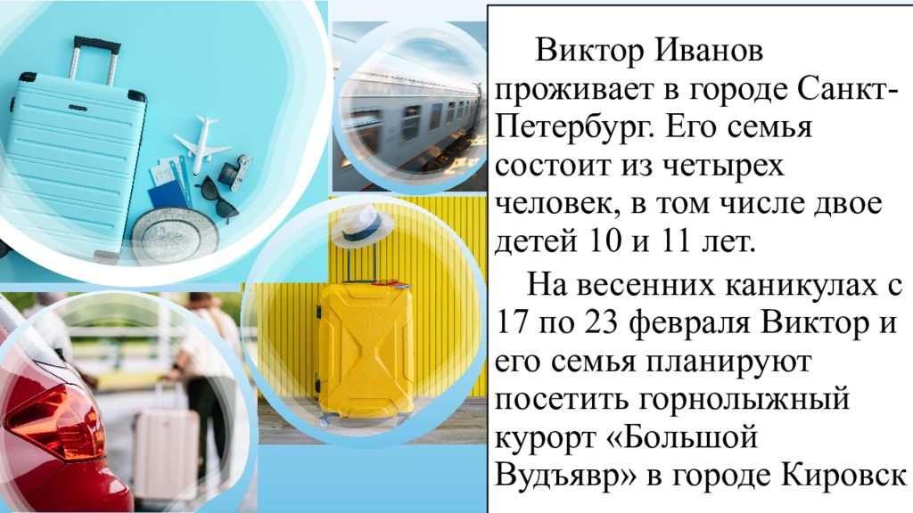 Виктор Иванов проживает в городе Санкт-Петербург. Его семья состоит из четырех человек, в том числе двое детей 10 и 11 лет. На весенних каникулах с 17 по 23 февраля Виктор и его семья планируют посетить горнолыжный курорт «Большой Вудъявр » в городе Кировск