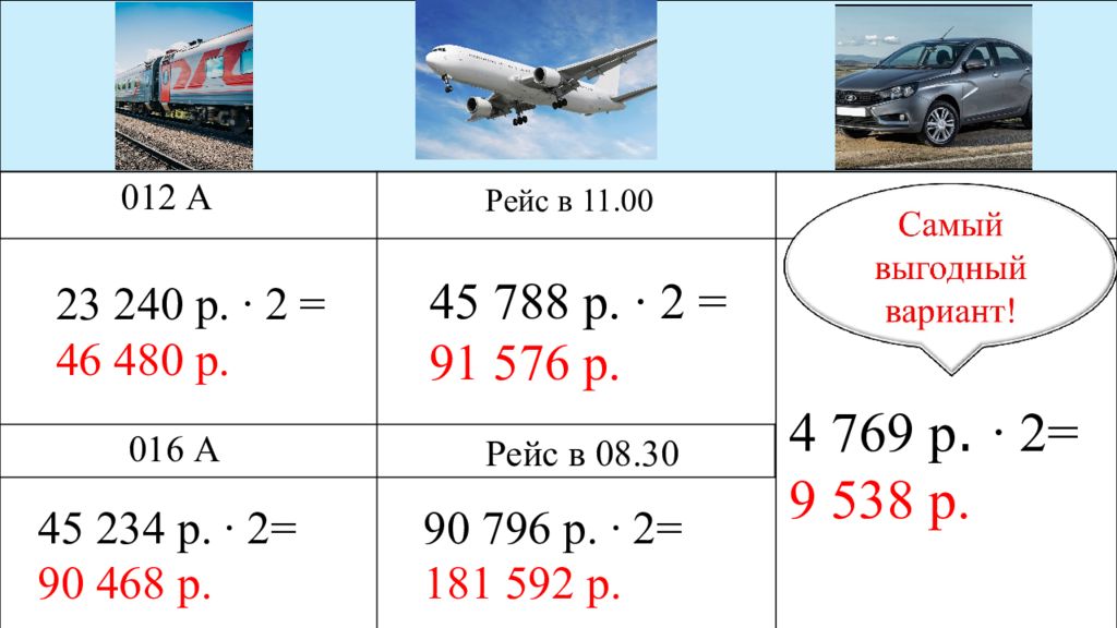 23 240 р. ∙ 2 = 46 480 р. 45 234 р. ∙ 2= 90 468 р. 90 796 р. ∙ 2= 181 592 р. 45 788 р. ∙ 2 = 91 576 р. 4 769 р. ∙ 2= 9 538 р. 016 А 012 А Рейс в 11.00 Рейс в 08.30