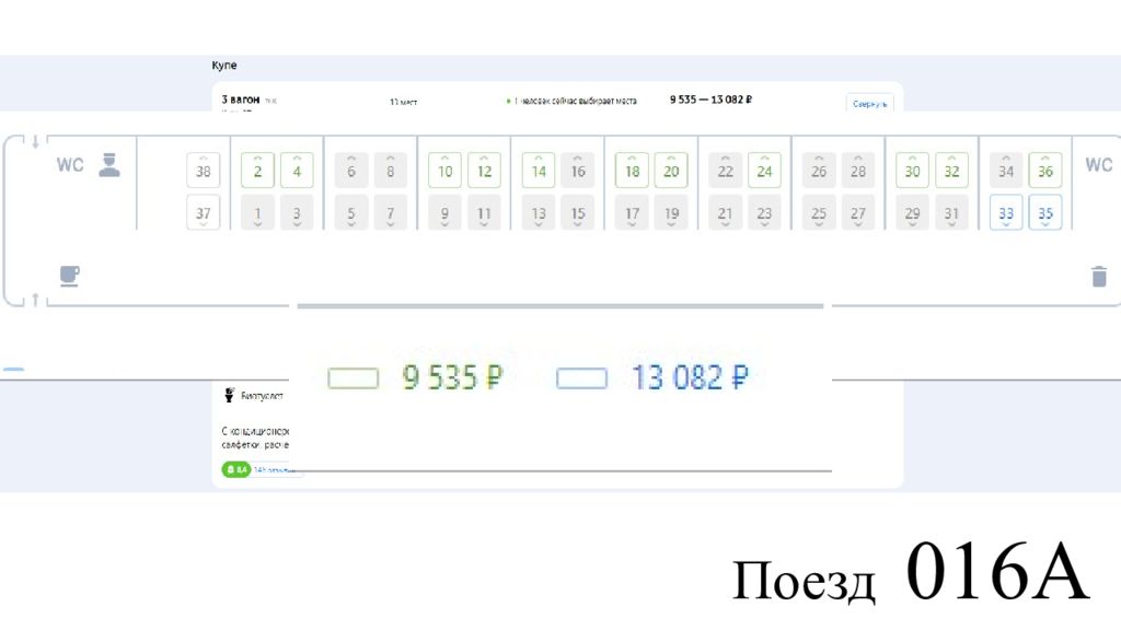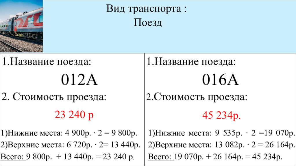Вид транспорта : Поезд Название поезда: 012А 2. Стоимость проезда: Название поезда: 016А 2. Стоимость проезда: 23 240 р 45 234р. 1)Нижние места: 4 900 р. ∙ 2 = 9 800р. 2)Верхние места: 6 720р. ∙ 2= 13 440р. Всего: 9 800 р. + 13 440 р. = 23 240 р. 1)Нижние места: 9 535р. ∙ 2 =19 070р. 2)Верхние места: 13 082р. ∙ 2 = 26 164р. Всего: 19 070р. + 26 164р. = 45 234р.