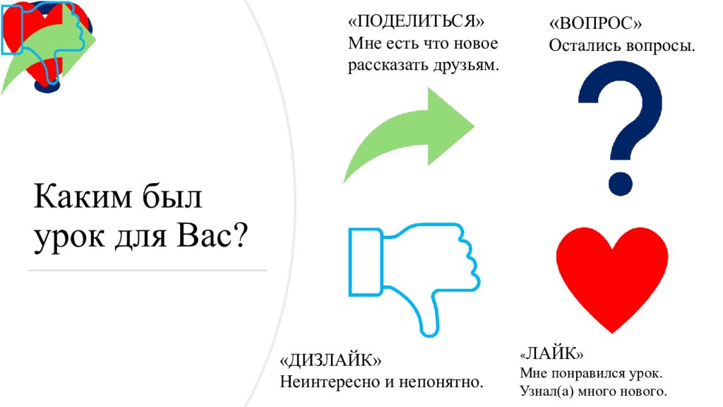 Каким был урок для Вас ? «ПОДЕЛИТЬСЯ» Мне есть что новое рассказать друзьям. « ВОПРОС» Остались вопросы. «ДИЗЛАЙК» Неинтересно и непонятно. « ЛАЙК » Мне понравился урок. Узнал(а) много нового.