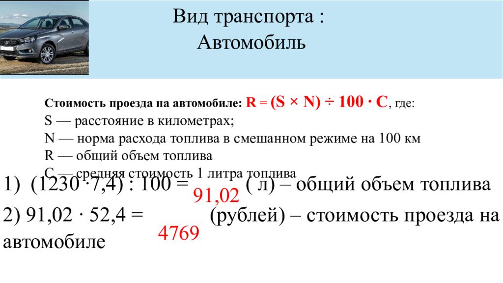 Вид транспорта : Автомобиль 1) (1230 ∙7,4) : 100 = ( л) – общий объем топлива 2) 91,02 ∙ 52,4 = (рублей) – стоимость проезда на автомобиле 91,02 4769 Стоимость проезда на автомобиле: R = (S × N) ÷ 100 ∙ С, где: S — расстояние в километрах; N — норма расхода топлива в смешанном режиме на 100 км R — общий объем топлива С — средняя стоимость 1 литра топлива