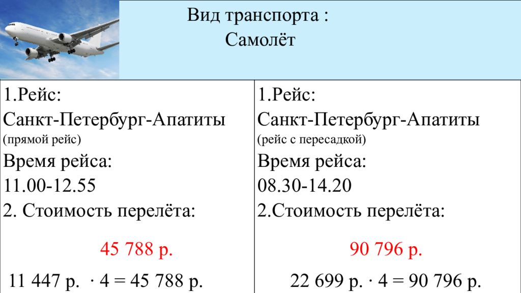 Вид транспорта : Самолёт Рейс: Санкт-Петербург-Апатиты (прямой рейс) Время рейса: 11.00-12.55 2. Стоимость перелёта: Рейс: Санкт-Петербург-Апатиты (рейс с пересадкой) Время рейса: 08.30-14.20 2.Стоимость перелёта: 45 788 р. 11 447 р. ∙ 4 = 45 788 р. 22 699 р. ∙ 4 = 90 796 р. 90 796 р.
