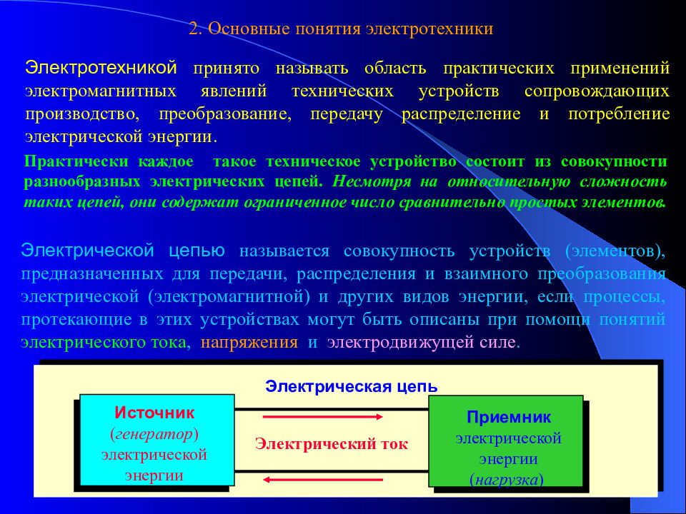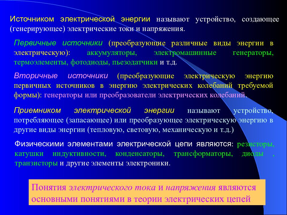 Источником электрической энергии называют устройство, создающее (генерирующее) электрические токи и напряжения. Первичные источники ( преобразующие различные виды энергии в электрическую) : аккумуляторы, электромашинные генераторы, термоэлементы, фотодиоды, пьезодатчики и т.д. Вторичные источники ( преобразующие электрическую энергию первичных источников в энергию электрических колебаний требуемой формы) : генераторы или преобразователи электрических колебаний. Приемником электрической энергии называют устройство, потребляющее (запасающее) или преобразующее электрическую энергию в другие виды энергии (тепловую, световую, механическую и т.д.) Физическими элементами электрической цепи являются : резисторы, катушки индуктивности, конденсаторы, трансформаторы, диоды, транзисторы и другие элементы электроники. Понятия электрического тока и напряжения являются основными понятиями в теории электрических цепей