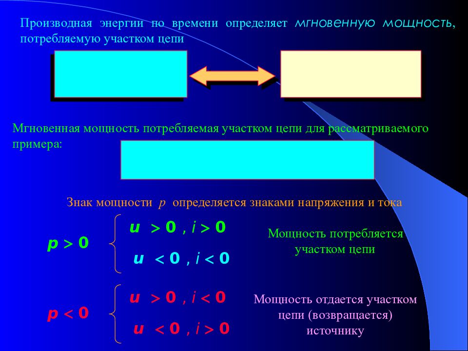 Производная энергии по времени определяет мгновенную мощность, потребляемую участком цепи Знак мощности p определяется знаками напряжения и тока p 0 u 0, i 0 u 0, i 0 Мощность потребляется участком цепи p 0 u 0, i 0 u 0, i 0 Мощность отдается участком цепи (возвращается) источнику Мгновенная мощность потребляемая участком цепи для рассматриваемого примера :