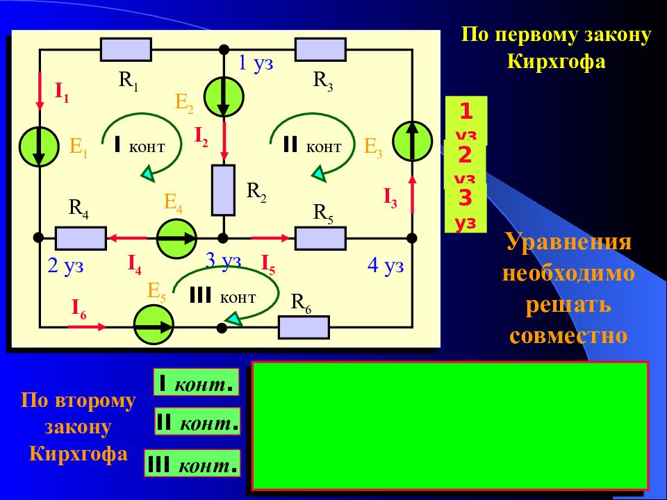 По первому закону Кирхгофа По второму закону Кирхгофа Уравнения необходимо решать совместно 1 уз 2 уз 3 уз I конт. II конт. III конт. 1 уз I 1 I 2 I 3 I 4 I 5 I 6 R 1 R 2 R 3 E 1 E 2 E 3 E 4 E 5 R 4 R 5 R 6 2 уз 3 уз 4 уз I конт II конт III конт