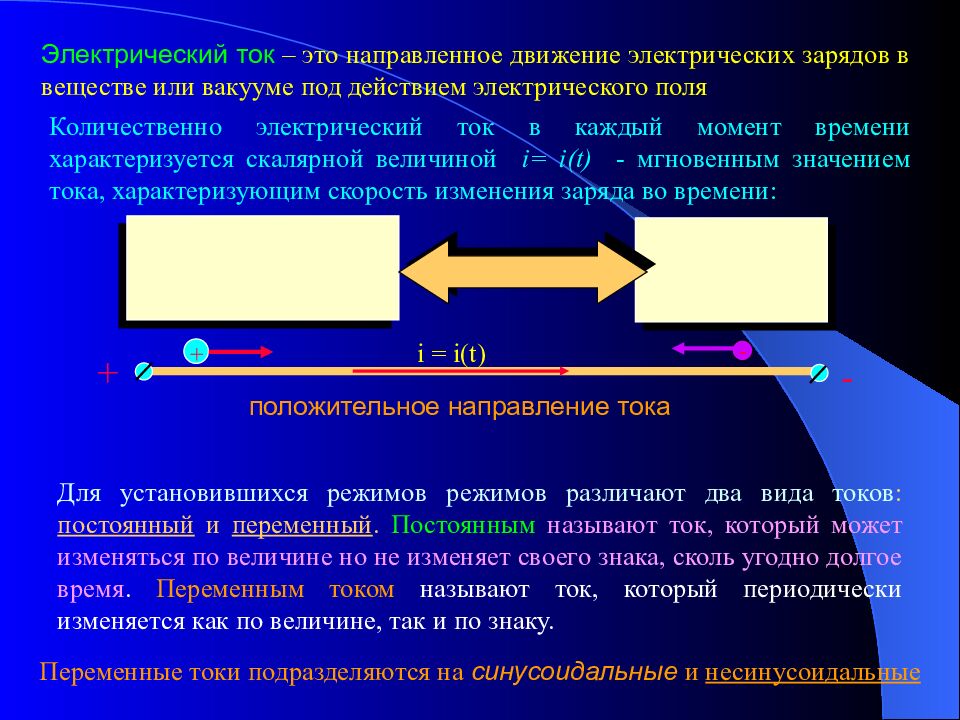 Электрический ток – это направленное движение электрических зарядов в веществе или вакууме под действием электрического поля Количественно электрический ток в каждый момент времени характеризуется скалярной величиной i= i(t) - мгновенным значением тока, характеризующим скорость изменения заряда во времени : + - i = i(t) положительное направление тока + - Для установившихся режимов режимов различают два вида токов : постоянный и переменный. Постоянным называют ток, который может изменяться по величине но не изменяет своего знака, сколь угодно долгое время. Переменным током называют ток, который периодически изменяется как по величине, так и по знаку. Переменные токи подразделяются на синусоидальные и несинусоидальные