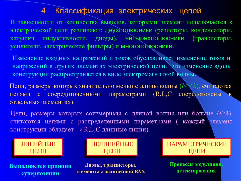 4. Классификация электрических цепей В зависимости от количества выводов, которыми элемент подключается к электрической цепи различают : двухполюсники (резисторы, конденсаторы, катушки индуктивности, диоды), четырехполюсники (транзисторы, усилители, электрические фильтры) и многополюсники. Изменение входных напряжений и токов обуславливает изменение токов и напряжений в других элементах электрической цепи. Это изменение вдоль конструкции распространяется в виде электромагнитной волны. Цепи, размеры которых значительно меньше длины волны ( l << ), считаются цепями с сосредоточенными параметрами ( R,L,C сосредоточены в отдельных элементах). Цепи, размеры которых соизмеримы с длиной волны или больше ( l ), считаются цепями с распределенными параметрами ( каждый элемент конструкции обладает R,L,C длинные линии). ПАРАМЕТРИЧЕСКИЕ ЦЕПИ Процессы модуляции, детектирования НЕЛИНЕЙНЫЕ ЦЕПИ Диоды, транзисторы, элементы с нелинейной ВАХ ЛИНЕЙНЫЕ ЦЕПИ Выполняется принцип суперпозиции