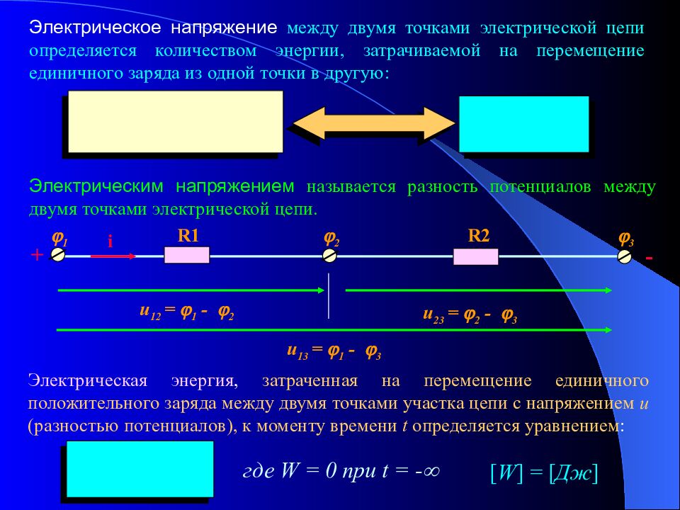 Электрическим напряжением называется разность потенциалов между двумя точками электрической цепи. u 12 = 1 - 2 1 2 3 R1 R2 i u 23 = 2 - 3 u 13 = 1 - 3 - + Электрическое напряжение между двумя точками электрической цепи определяется количеством энергии, затрачиваемой на перемещение единичного заряда из одной точки в другую : Электрическая энергия, затраченная на перемещение единичного положительного заряда между двумя точками участка цепи с напряжением u (разностью потенциалов), к моменту времени t определяется уравнением : где W = 0 при t = - [ W ] = [ Дж ]