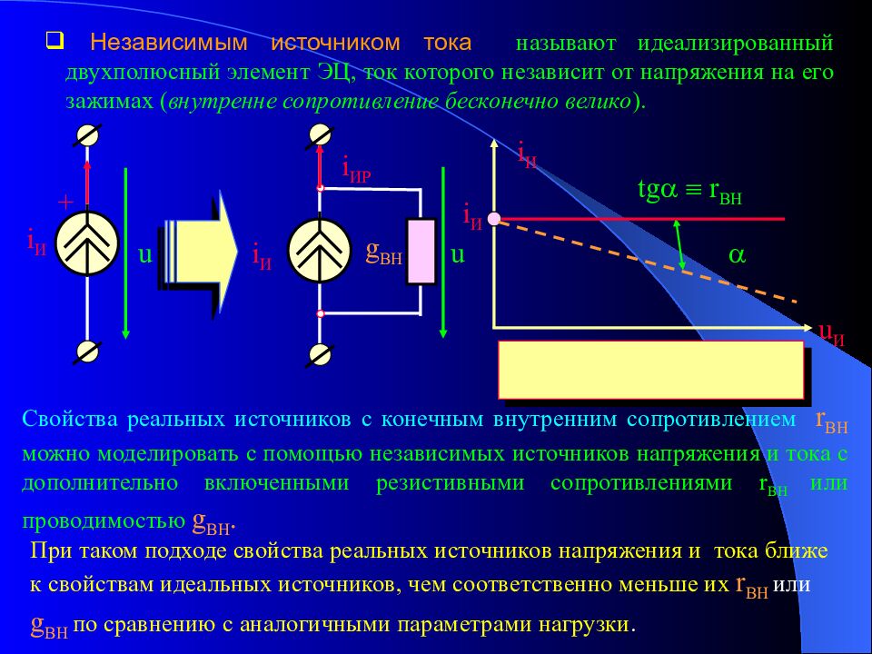 Независимым источником тока называют идеализированный двухполюсный элемент ЭЦ, ток которого независит от напряжения на его зажимах ( внутренне сопротивление бесконечно велико ). i И u g ВН i ИР i И + u i И u И tg r ВН i И Свойства реальных источников с конечным внутренним сопротивлением r ВН можно моделировать с помощью независимых источников напряжения и тока с дополнительно включенными резистивными сопротивлениями r ВН или проводимостью g ВН. При таком подходе свойства реальных источников напряжения и тока ближе к свойствам идеальных источников, чем соответственно меньше их r ВН или g ВН по сравнению с аналогичными параметрами нагрузки.