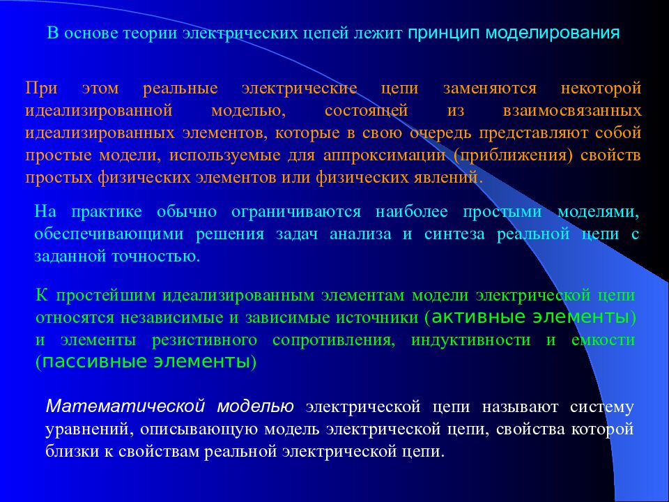 В основе теории электрических цепей лежит принцип моделирования При этом реальные электрические цепи заменяются некоторой идеализированной моделью, состоящей из взаимосвязанных идеализированных элементов, которые в свою очередь представляют собой простые модели, используемые для аппроксимации (приближения) свойств простых физических элементов или физических явлений. На практике обычно ограничиваются наиболее простыми моделями, обеспечивающими решения задач анализа и синтеза реальной цепи с заданной точностью. К простейшим идеализированным элементам модели электрической цепи относятся независимые и зависимые источники ( активные элементы ) и элементы резистивного сопротивления, индуктивности и емкости ( пассивные элементы ) Математической моделью электрической цепи называют систему уравнений, описывающую модель электрической цепи, свойства которой близки к свойствам реальной электрической цепи.