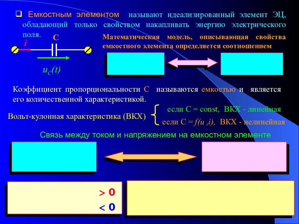 Емкостным элементом называют идеализированный элемент ЭЦ, обладающий только свойством накапливать энергию электрического поля. Математическая модель, описывающая свойства емкостного элемента определяется соотношением Коэффициент пропорциональности С называются емкостью и является его количественной характеристикой. Вольт-кулонная характеристика (ВКХ) если С = const, ВКХ - линейная если С = f(u,i), ВКХ - нелинейная Связь между током и напряжением на емкостном элементе 0 0 С i u С (t)