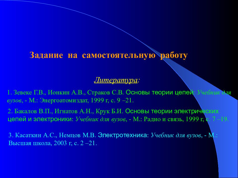 Литература : 1. Зевеке Г.В., Ионкин А.В., Страков С.В. Основы теории цепей : Учебник для вузов, - М. : Энергоатомиздат, 1999 г, с. 9 –21. 2. Бакалов В.П., Игнатов А.Н., Крук Б.И. Основы теории электрических цепей и электроники : Учебник для вузов, - М. : Радио и связь, 1999 г, с. 7 –19. 3. Касаткин А.С., Немцов М.В. Электротехника : Учебник для вузов, - М. : Высшая школа, 2003 г, с. 2 –21. Задание на самостоятельную работу