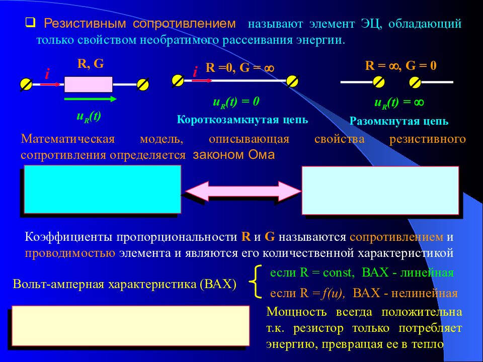 Резистивным сопротивлением называют элемент ЭЦ, обладающий только свойством необратимого рассеивания энергии. R, G i u R (t) R =0, G = u R (t) = 0 i Короткозамкнутая цепь R = , G = 0 u R (t) = Разомкнутая цепь Математическая модель, описывающая свойства резистивного сопротивления определяется законом Ома Коэффициенты пропорциональности R и G называются сопротивлением и проводимостью элемента и являются его количественной характеристикой Вольт-амперная характеристика (ВАХ) если R = const, ВАХ - линейная если R = f(u), ВАХ - нелинейная Мощность всегда положительна т.к. резистор только потребляет энергию, превращая ее в тепло